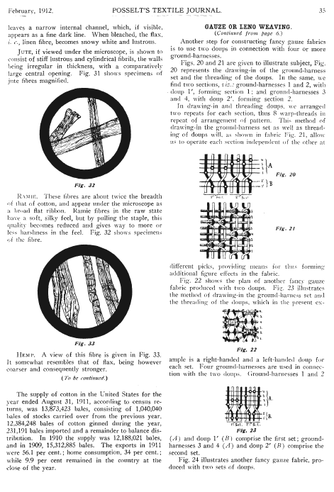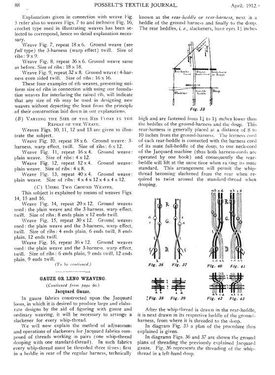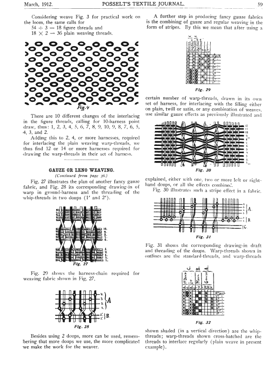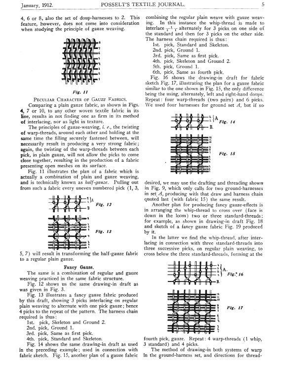 Gauze or Leno Weaving, Posselt, E. A. Posselt's Textile Journal, 1912, 2 pages. Note: Scanned images provided by John Cropper. Posted December 15, 2005. SAMPLE PAGE. File size 400 KB PDF