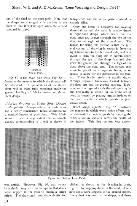 Leno Weaving and Design, Part 1, Shinn, W. E. and A. E. McKenna. The Melliand, Vol. 2, No. 1 (April 1930), 6 pages. Posted March 5, 2002. SAMPLE PAGE. File size 1.4 MB PDF