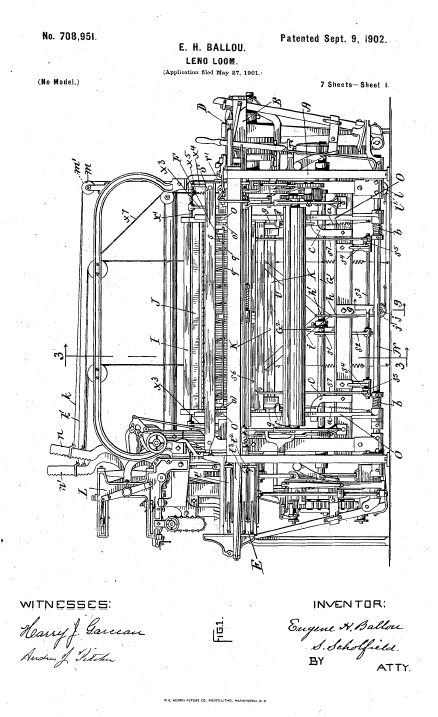 Leno Loom, US00708951, Ballou, E. H.. September 9, 1902, 11 pages. Posted January 18, 2005. SAMPLE PAGE. File size 1.1MB PDF