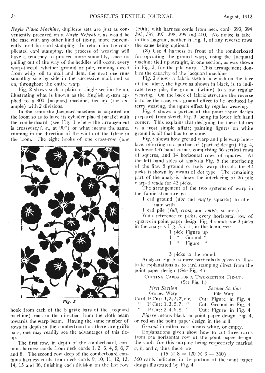 Jacquard Terry Pile Fabrics, Posselt, E. A. Posselt's Textile Journal, 1912, 5 pages. Note: Scanned images provided by John Cropper. Posted December 17, 2005. SAMPLE PAGE. File size 476 KB PDF