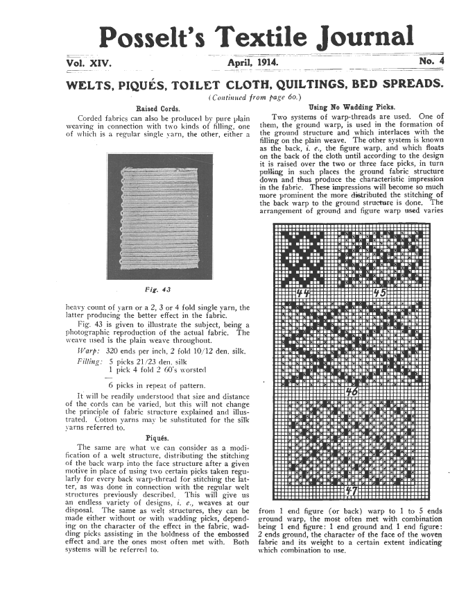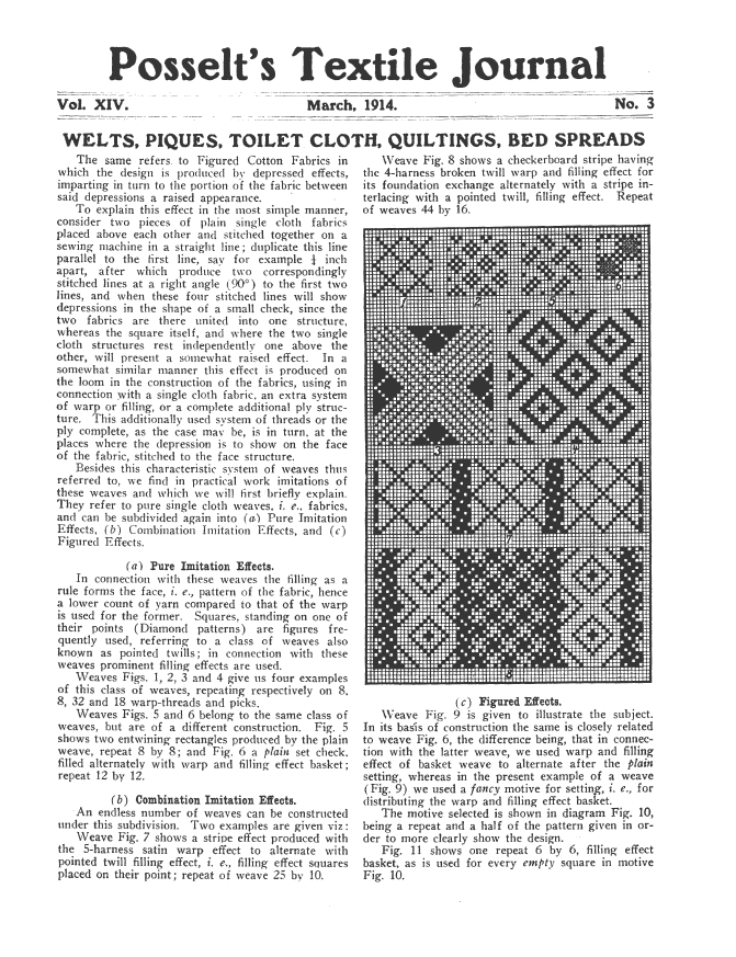 Welts, Piques, Toilet Cloth, Quiltings, Bed Spreads, Posselt, E. A. Posselt's Textile Journal, 1911, 4 pages. Note: Scanned images provided by John Cropper. Posted February 20, 2006. SAMPLE PAGE. File size 858 KB PDF