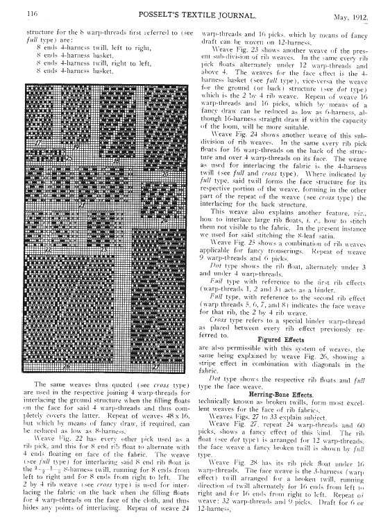 Rib Weave, Constructed withBacking or Rib Picks, Posselt, E. A. Posselt's Textile Journal, 1912, 3 pages. Note: Scanned images provided by John Cropper. Posted December 15, 2005. SAMPLE PAGE. File size 364 KB PDF