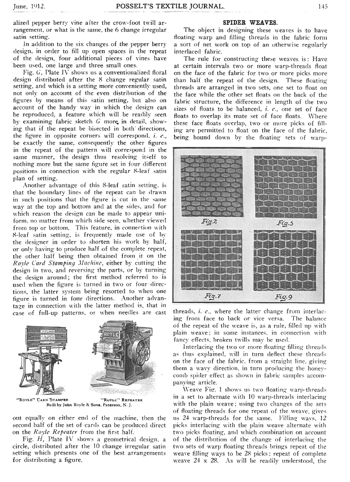 Spider Weaves, Posselt, E. A. Posselt's Textile Journal, 1912, 2 pages. Note: Scanned images provided by John Cropper. Posted December 16, 2005. SAMPLE PAGE. File size 500 KB PDF