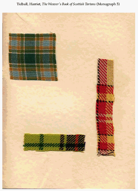 Tidball, Harriet. The Weaver's Book of Scottish Tartans Portfolio, Shuttle Craft, 1962, 9 pages. Note: Accompaniment to Shuttle Craft Monograph 5. Posted September 17, 2000. SAMPLE PAGE. File size 2.7 MB PDF