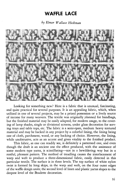 Waffle Lace, Hickman, Elmer Wallace. Shuttle-Craft Bulletin, 1957, 5 pages. Posted February 3, 2005. CD (HWDA12). SAMPLE PAGE. File size 860 KB PDF